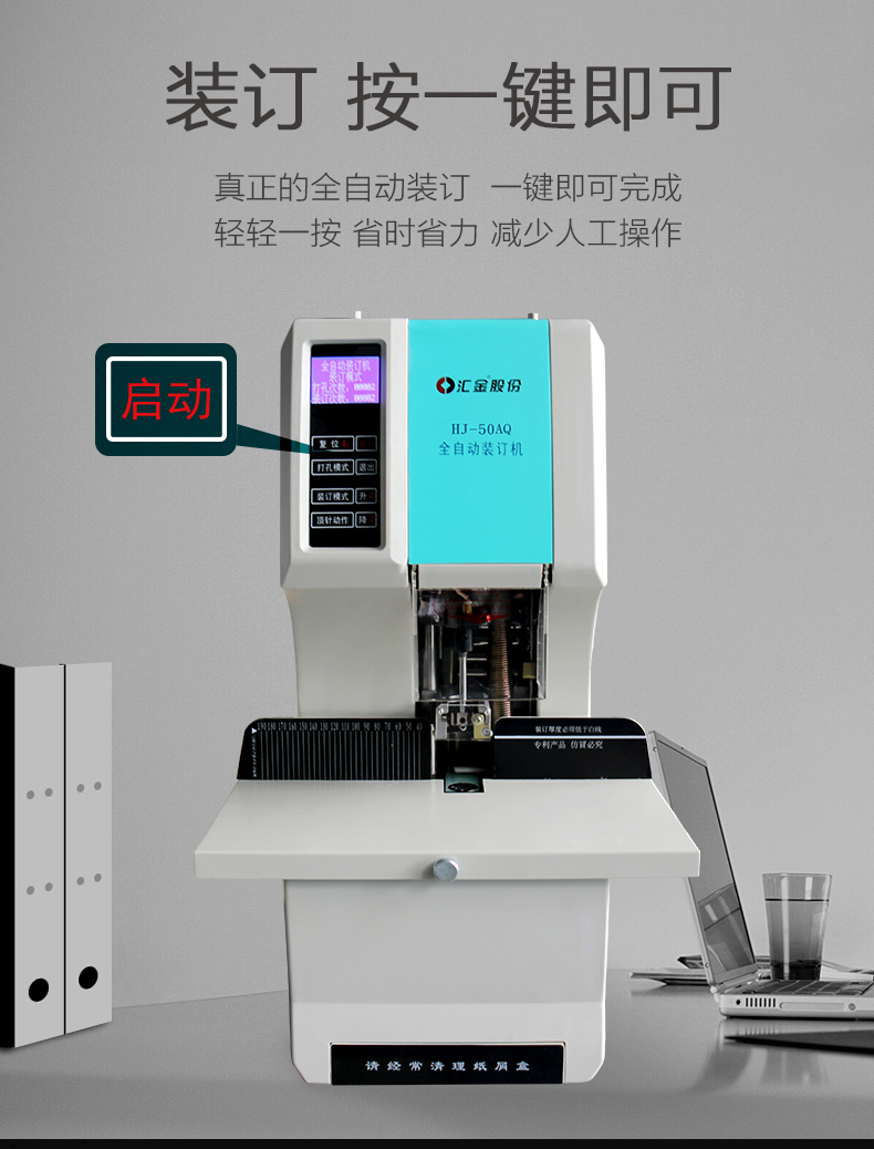 HJ-50AQ是一款新结构的经济型全自动装订机。该款设备摒弃了繁琐装饰,使整机更加简洁、操作方便、安全可靠、经济实用。广泛应用于企事业单位的财务账册、文档资料的规范装订,成型美观,已得到市场的充分认可。