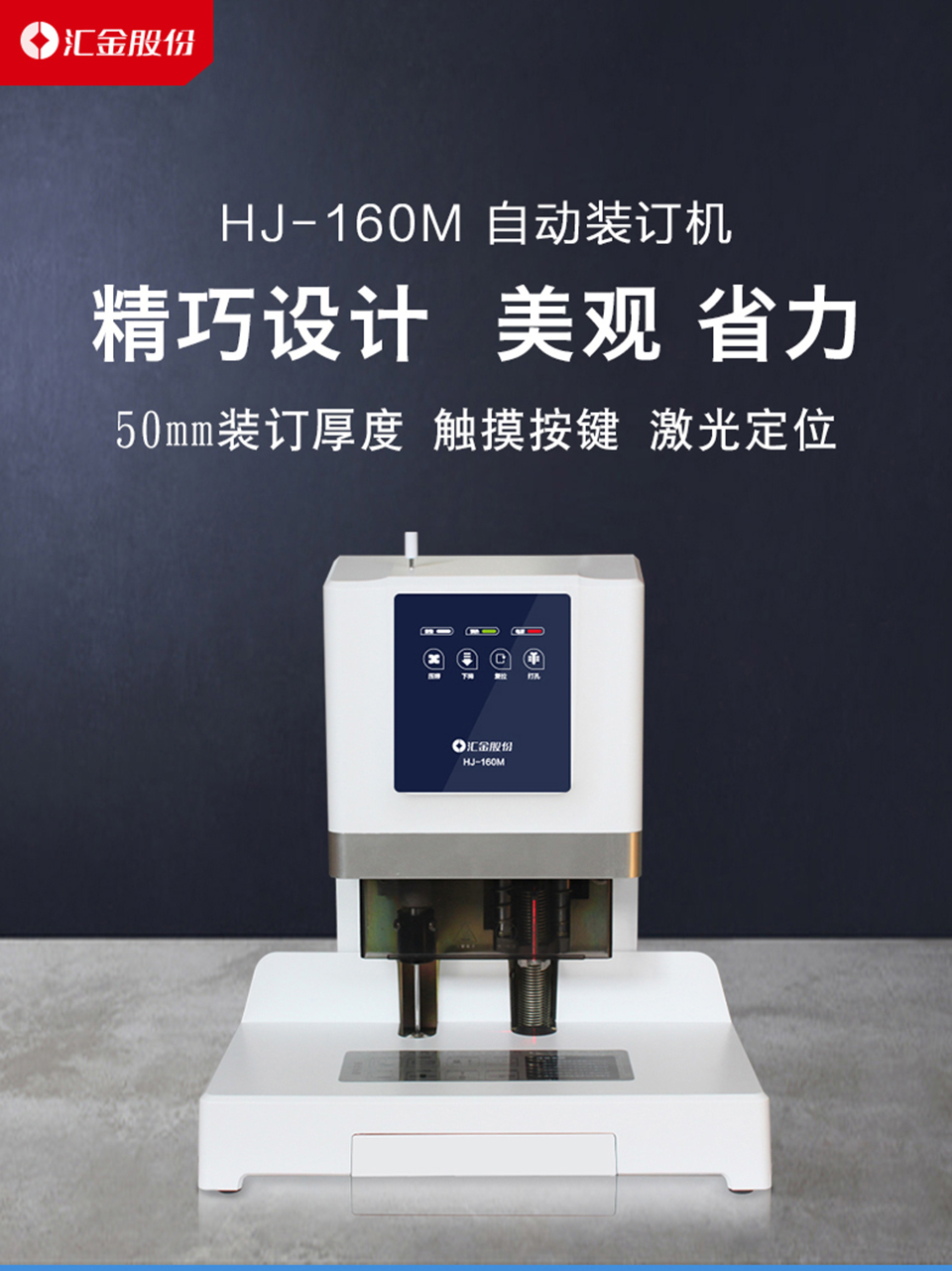 HJ-160M自动装订机是一款自动化装订设备。该款产品外观新颖,结构精巧,操作简单方便,性能稳定,安全可靠,人性化设计,是财务办公、档案管理机构规范保管的理想选择。